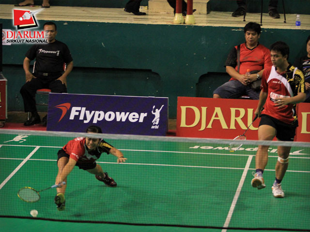 Pemain PB Djarum, Jones Ralfy J/Nurbeta Kwanrico berusaha mengembalikan kok ke arah pemain Tsunami/Keshab Timur, Yusuf Akhmad/ Lidyawati dalam babak perempat final ganda campuran dewasa Djarum Sirkuit Nasional Surabaya di GOR Sudirman, Surabaya.