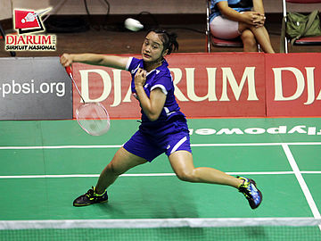 Intan Dwi Jayanti (PB Djarum Kudus) berusaha mengembalikan bola ke arah Berliyan Sudrajat (Semen Gresik).