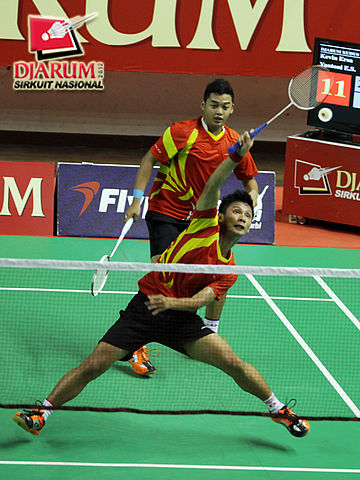 Rian Swastedian/Masita Mahmudin (Pusdiklat Jaya Raya) berusaha mengembalikan bola ke arah pasangan ganda campuran taruna PB Djarum Kudus, Ricky Alverino/Febriani Endar.