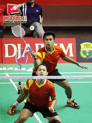 Shaibul Wafa/M. Asykuru (Pelabuhan II) menyambut serve dari Pasangan ganda putra dewasa PB Djarum Kudus, Rendra Wijaya/Rian Sukmawan.