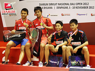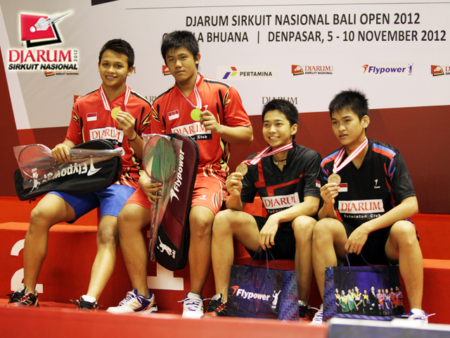Juara pertama, Kevin Ersa/Yantoni Edy (kiri) dan semifinalis ganda taruna putra asal PB Djarum Kudus, Ricky Alverino/Abu Bakar berpose bersama usai pembagian medali.