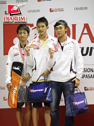 Juara pertama tunggal taruna putra, Ihsan Maulana (kiri) berfoto bersama semifinalis, Bayu Pangisthu dan Rudi Cahyadi yang sama-sama dari PB Djarum Kudus.