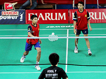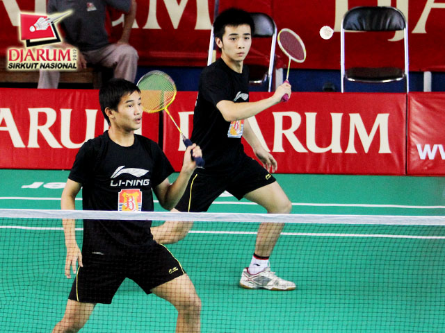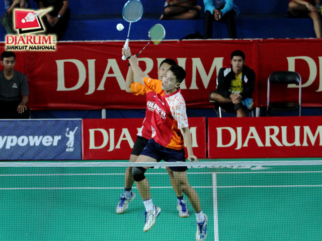 Pasangan ganda remaja putra dalam babak qualifikasi, Dioda Kanza/ Rifky (Pusdiklat Jaya Raya) yang sedang berhadapan dengan pasangan Henwinner/ Reno Prabowo (Guna Dharma).