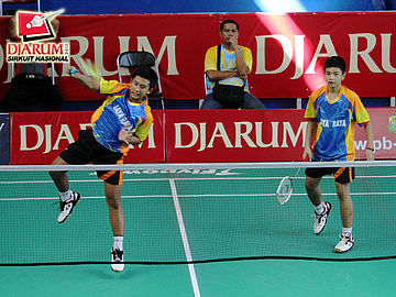 Sakti yang berpasangan dengan Yuda dari PB. SGS PLN sedang mengembalikan kok kepada lawannya, Aji Firmansyah/ M Zico (Mutiara Bandung).