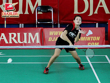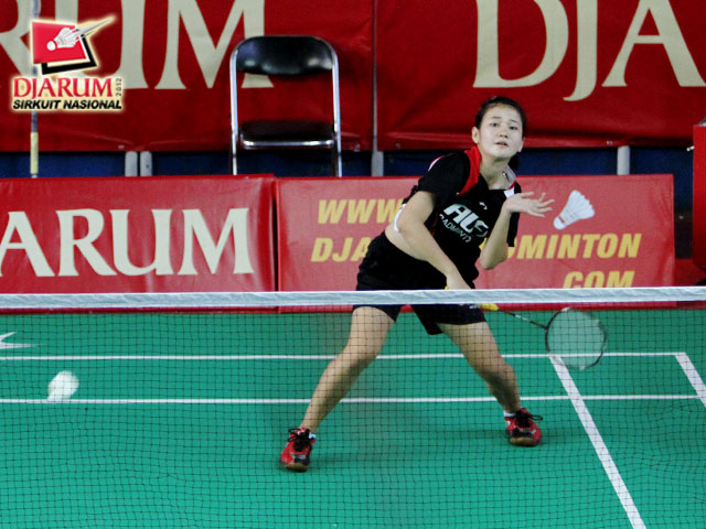 Dianita (Guna Dharna) sedang mengembalikan kok kepada lawannya, Mychelle C (Djarum Kudus), pada babak qualifikasi