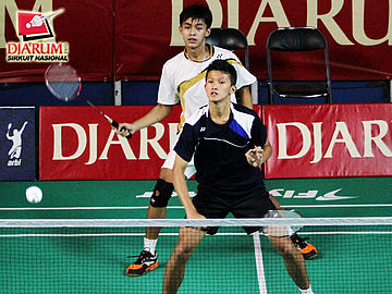 Pasangan ganda taruna putra Rafli Rizki Ristian dan Stefan I.H (Mutiara Bandung) yang sedang bertanding melawan Kevin Ersa / Ricky Alverino Sidharta (Djarum Kudus).