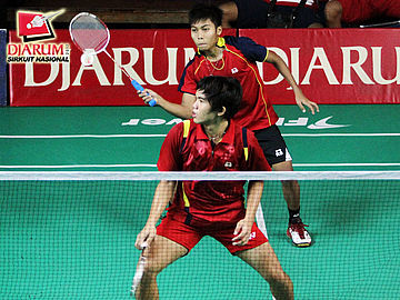 Pasangan ganda taruna putra Tedi Supriadi / Yantoni Edy Saputra (Djarum Kudus) yang sedang bertanding melawan Didi Cardy dan Roni Andreas dari PT. Satu.