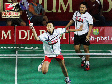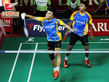 Priayi Reza Anang yang berpasangan dengan Dian Hadi Syaputra (Jaya Raya Suryanaga) sedang memukul kok untuk dikembalikan kepada pasangan Arsya Isnanu Ardi Putra/ Hantoro (Djarum Kudus).
