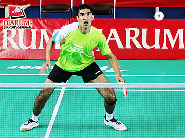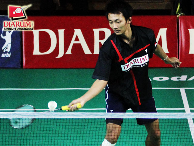 Ihsan Maulana Mustofa (Djarum Kudus) dalam posisi siap mengembalikan kok kepada lawannya, Muhammad Nizar (Pelatprov PBSI DKI Jakarta).