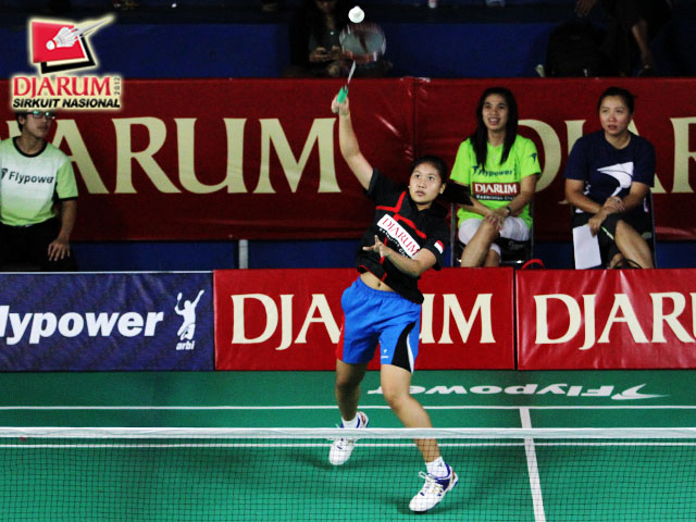 Rena Asela (Djarum Kudus) sedang mengembalikan kok kepada Fina Nuraena dari SGS PLN.