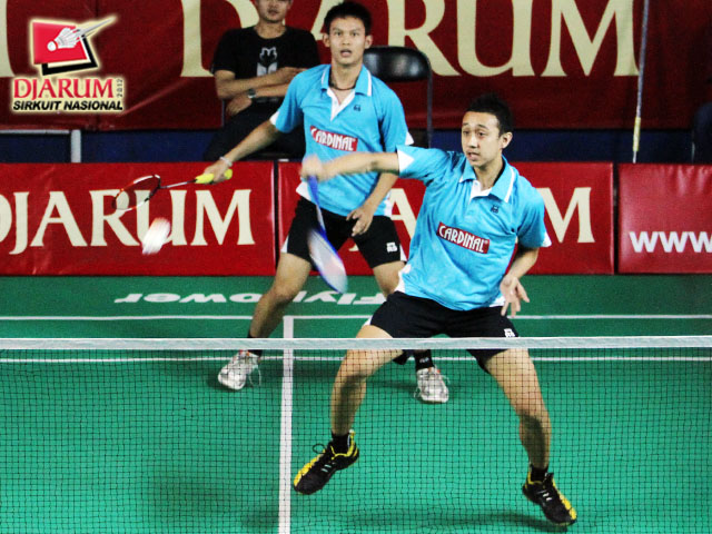Ricky Alverino Sidharta yang berpasangan dengan Kevin Ersa (Djarum Kudus) sedang mengembalikan kok kepada pasangan Rafli Rizki Ristian/ Stefan I. H (Mutiara Bandung).