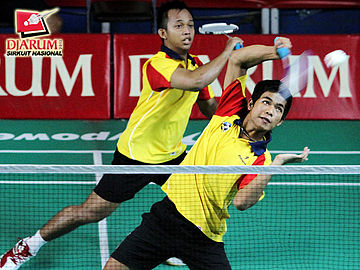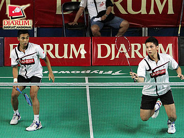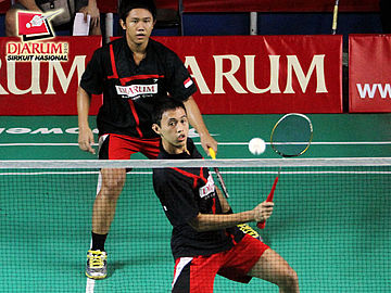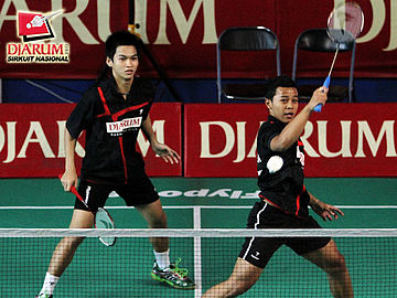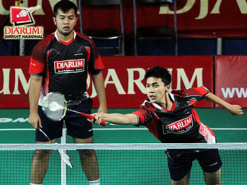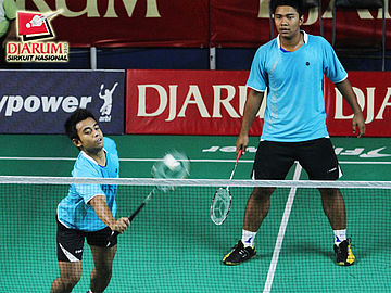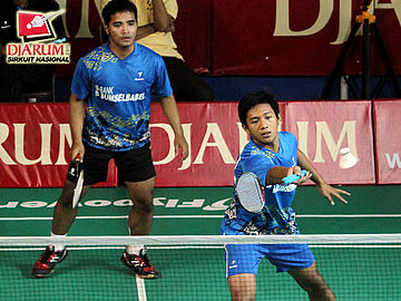 Rian Sukmawan yang berpasangan dengan Rendra Wijaya (Djarum Kudus) sedang mengembalikan kok kepada pasangan Sandi dan Deny (Bank Sumsel-Babel).