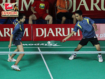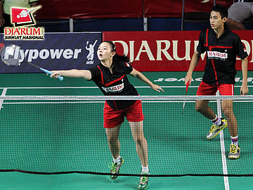 Della Augustia Surya yang berpasangan dengan Tedi Supriadi (Djarum Kudus) sedang memukul kok untuk dikembalikan kepada pasangan Bagus Haryanto / Mareta Dea Giovani (Mutiara Bandung).