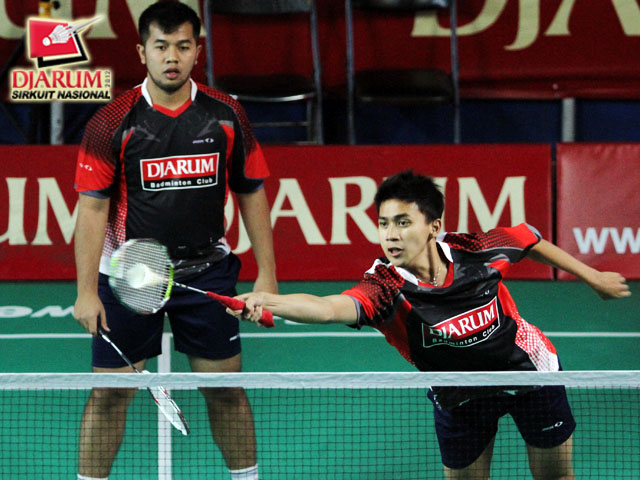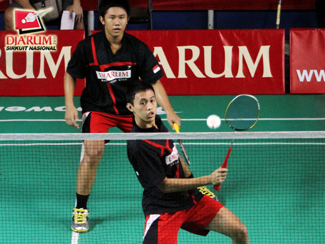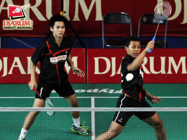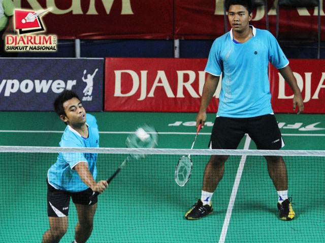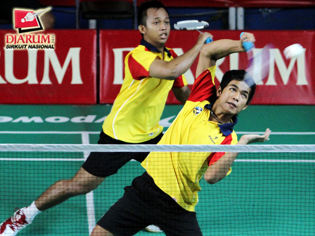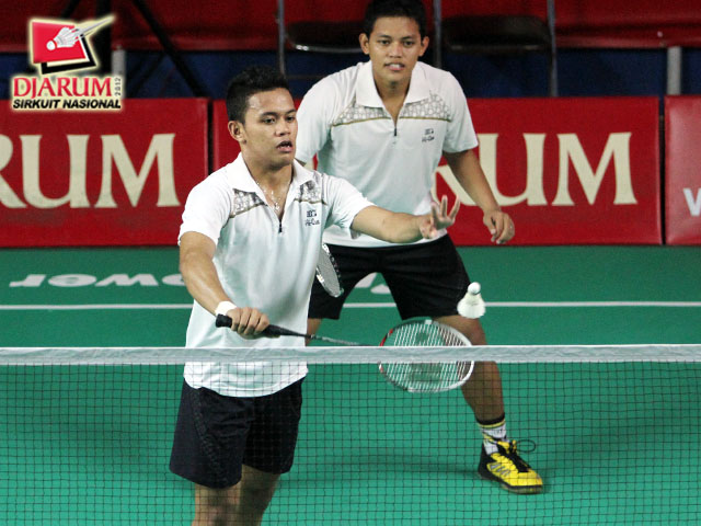 Pasangan ganda dewasa putra, Riyo Arief dan Rizky Hidayat dari Hi Qua Wima yang sedang bertanding melawan pasangan Dandi Prabudita/ Wifqi Windarto (Djarum Kudus).