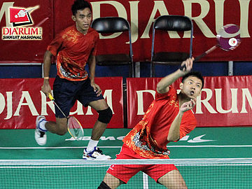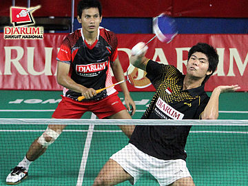 Pasangan ganda dewasa putra dari SGS PLN, Imam Sodikin dan Ujang Suherlan yang sedang berhadapan dengan pasangan Rangga Yove Rianto / Seiko Wahyu Kusdianto (Djarum Kudus).