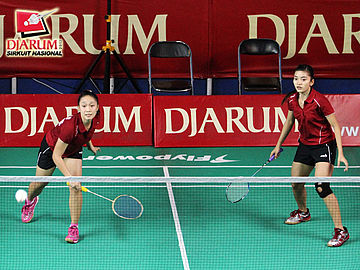 Murayama Yumi yang berpasangan dengan Anai Yuki sedang mengembalikan kok kepada pasangan Anggia Shitta Awanda dan Shella Devi Aulia dari Pelatnas.