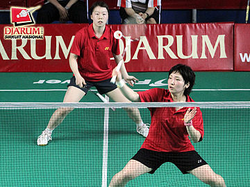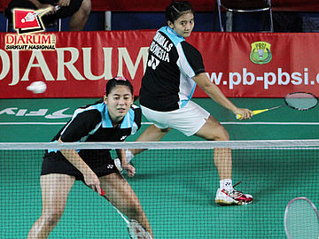 Natalia Deiske yang berpasangan dengan Novalia Agustianti (Tangkas Specs) sedang mengembalikan kok kepada pasangan Aan Dwi C / Mega Cahya Purnama (Hi Qua Wima).