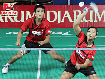 Subhan Hasan yang berpasangan dengan Nadya Melati (Pusdiklat Jaya Raya) sedang mengembalikan kok kepada pasangan Andhika Anhar / Keshya Nurvita Hanadia (SGS PLN).
