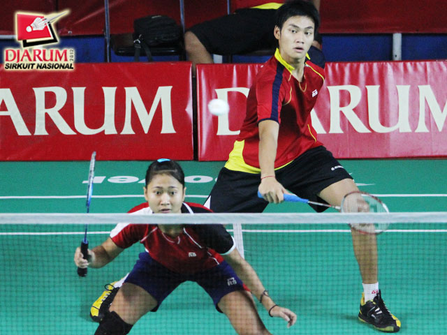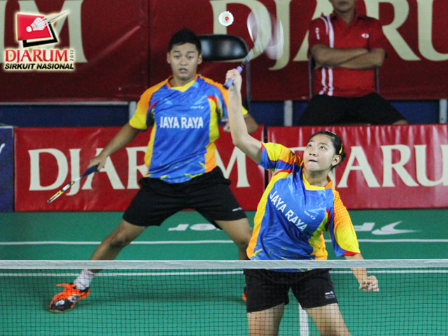Yodhi Satrio yang berpasangan dengan Ni Ketut Mahadewi (Jaya Raya Suryanaga) sedang mengembalikan kok kepada pasangan Desaula Gendy/ Aldo Abdillah (Pusdiklat Jaya Raya).