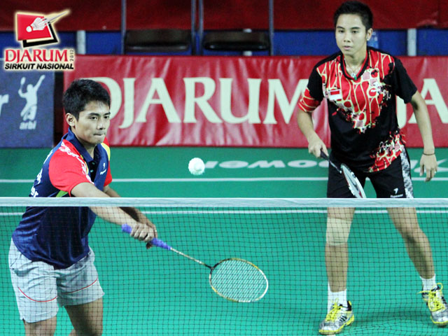 Pasangan ganda dewasa putra Chrisna Adi Wijaya dan Ridho Akbar dari Ganesha sedang bertanding melawan pasangan Dandi Prabudita / Wifqi Windarto (Djarum Kudus).