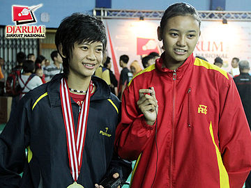 Pemenang ganda remaja putri, Berliyan Sudrajat dan Meirisa Cindy Sahputri sedang menceritakan kesan-kesannya menjadi pemenang di Djarum Badminton Sirkuit Nasional SGS PLN Jabar Open 2012.