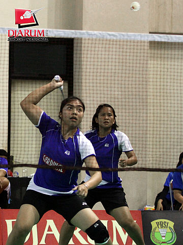 Pasangan Ayu/Dwi dari Mutiara Bandung berusaha mengembalikan kok ke arah pasangan Lita Nurlita/Variella Aprilsasi.