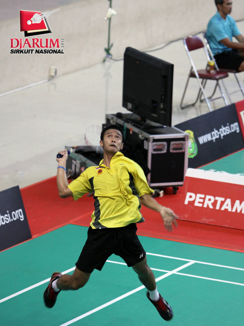 Trikus Hariyanto berusaha mengembalikan kok ke arah pasangan asal PB Djarum, Albert Saputra/Rizki Yanu Kresnayandi.
