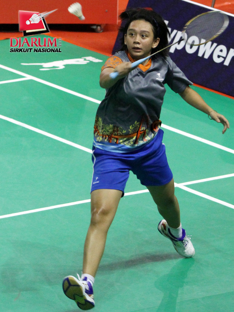 Pasangan asal PB Djarum, Aulia Putri/Kwanrico Nurbeta berusaha mengembalikan kok ke arah pasangan asal Pusdiklat Jaya Raya, Aris Budiharti/Dian Fitriani.