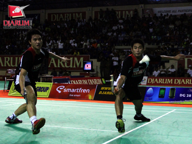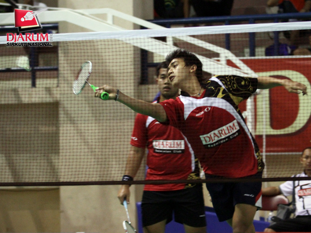 Pasangan asal PB Djarum, Dandi/Wifqi berusaha mengembalikan kok ke arah pasangan Chrisna/Ridho Akbar.