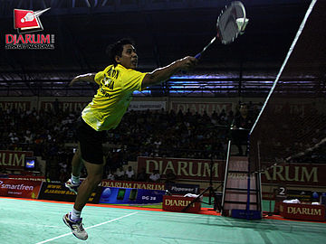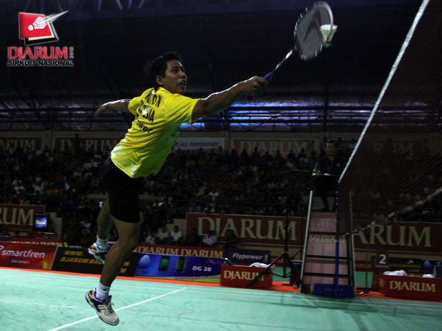 Pemain Tangkas Alfamart, Nova Widianto berusaha mengembalikan kok ke arah pasangan Rendra Wijaya/Rian Sukmawan (PB Djarum).