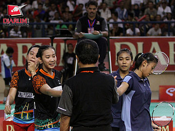 Pasangan asal SGS PLN Bandung, Devi Tika Permatasari/Keshya Nurvita serta pasangan Pusdiklat Jaya Raya, Aris Budiharti/Dian Fitriani bersalaman dengan wasit usai menyelesaikan laga