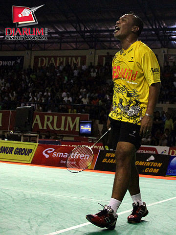 Ekspresi kemenangan Trikus Harianto (Golden Star) usai berhasil menaklukkan pasangan Rendra Wijaya/Rian Sukmawan (PB Djarum).