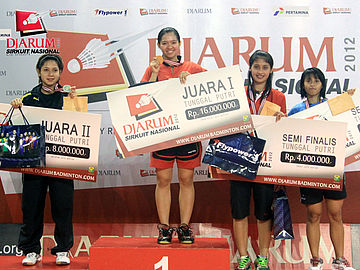 Juara tunggal dewasa putri berpose bersama usai pembagian hadiah