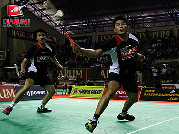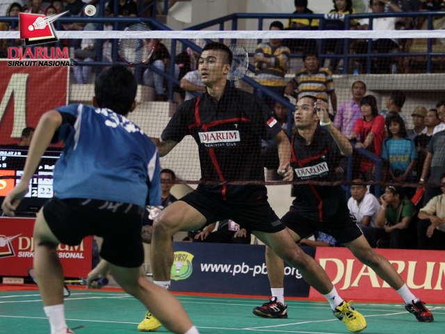 Pasangan asal PB Djarum Jeka Wiratama/Rafiddias Akhdan Nugroho berusaha mengembalikan kok ke arah pasangan Pusdiklat Jaya Raya, R. Eka Fajar/Rian Swastedian.