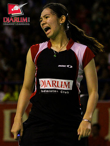 Ekspresi Devi Tika Permatasari (SGS PLN Bandung) ketika gagal meraih poin saat berhadapan kontra pasangan Pusdiklat Jaya Raya, Aris Budiharti/Dian Fitriani.