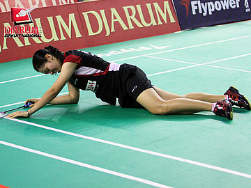Febby Angguni (PB Djarum) terjatuh ketika berusaha mengembalikan kok ke arah pemain Pertamina Indonesia, Ganis Nur Rahmadani