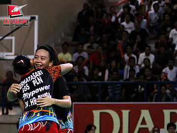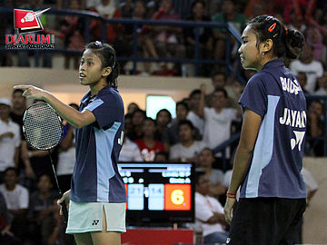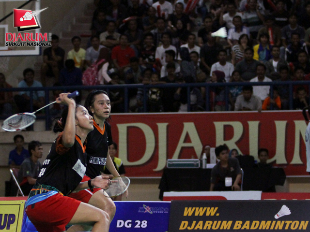 Pasangan asal SGS PLN Bandung, Devi Tika Permatasari/Keshya Nurvita berusaha mengembalikan kok ke arah pasangan Pusdiklat Jaya Raya, Aris Budiharti/Dian Fitriani