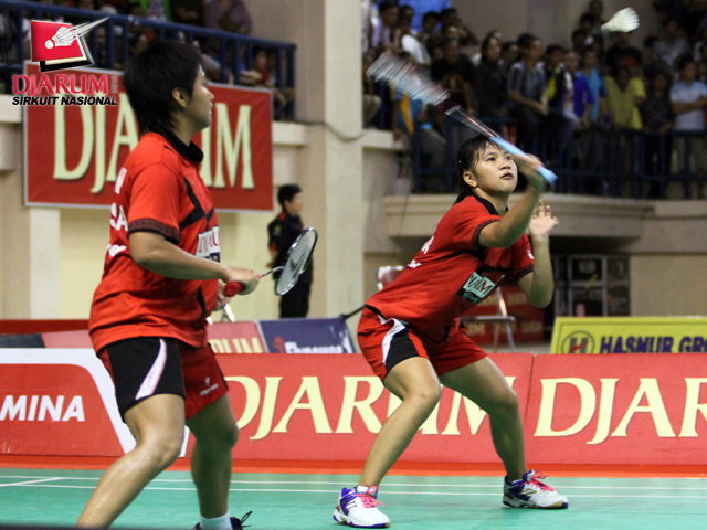 Pasangan asal PB Djarum, Thalia Clara Rossa Lomban/Yefi Anggraini berusaha mengembalikan kok ke arah pasangan Pelita Bakrie, Jauza Fadhila Sugiarto/Sarah Christian.