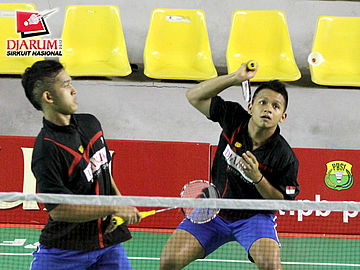 Jeka Wiratama/Kevin Ersa (PB Djarum Kudus) saat berduel dengan Christeven Howard/Haris Prathama (candra Wijaya).