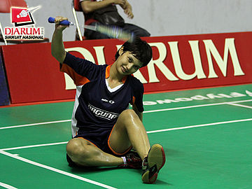 Lana Adriana Sarah (Ragunan Jkt) harus terjatuh saat berupaya menahan smash keras yang dilepaskan Nuansa Giva (Guna Dharma).