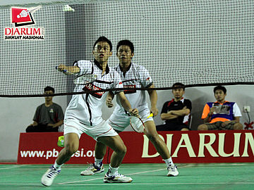 Tedi Supriadi/Yantoni Edi Saputra (PB Djarum Kudus) saat berusaha mengambalikan shuttlecock.