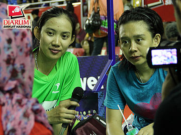 Juara ganda putri dewasa, Devi Tika Permatasari (kiri) dan Keshya Nurvita asal SGS PLN saat diwawancarai official tim Sirnas.