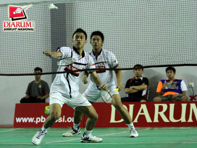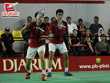 Pasanganan ganda putra dewasa Pelatnas, Hardianto/Rahmat Adianto bersiap menyambut serve.