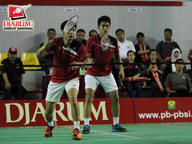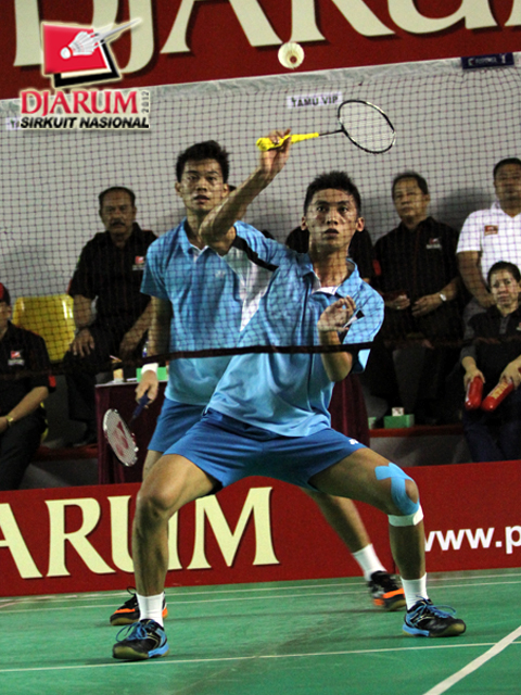Ronald (depan) dan pasangannya dari Pelatnas, Selfanus Geh bersiap menyambut bola.
