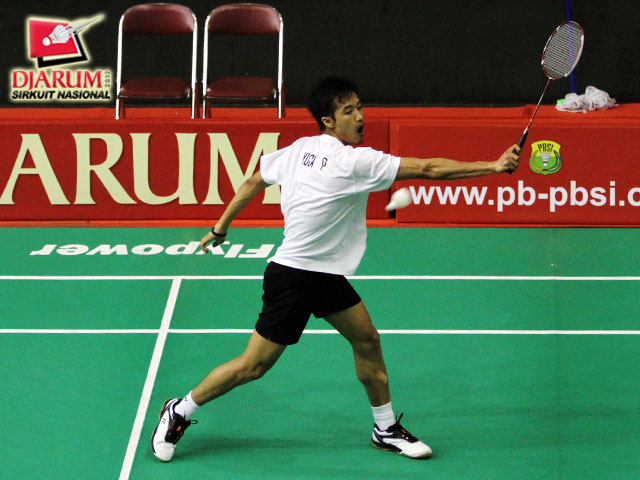 Arsya Isnanu Adi Putra yang berpasangan dengan Hantoro (Djarum Kudus) sedang mengembalikan kok untuk dikembalikan kepada pasangan Andrio Salmonco/ Septian Eka P (Jaya Raya Jakarta).