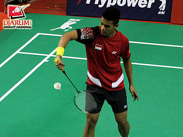 Arief Gifar Ramadhan (Pelatnas PBSI) sedang mengembalikan kok kepada lawannya, Fauzi Adnan (Puslada).