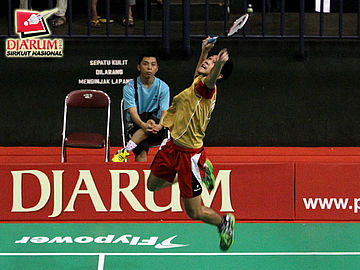 Setyaldi (Guna Dharma) sedang melakukan smash jump untuk mengembalikan kok kepada lawannya, Rico Hamdani (Tangkas Specs).