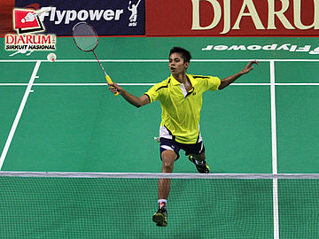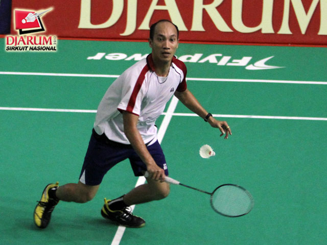 Bandar Sigit Pamungkas (Djarum Kudus) sedang mengembalikan kok kepada lawannya, I Putu Roy Danu sedang (Gemilang Surabaya).