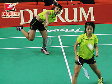 Monica Ngilu yang berpasangan Suci Ramadhani Lahe/ (Mutiara Bandung) sedang memukul kok untuk dikembalikan kepada pasangan Adinda Putri Pertiwi/ Yuanda Hemi (Tangkas Specs).