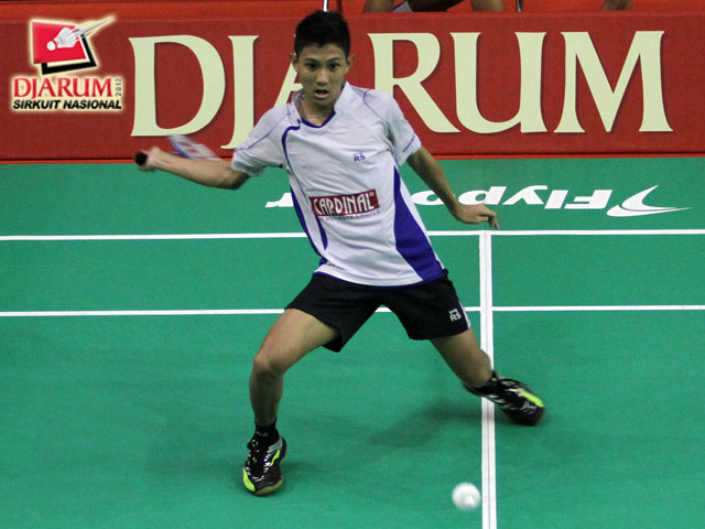 Eska Rivan Sanjaya sedang mengembalikan kok kepada lawannya, Reksy Aureza Megananda (Djarum Kudus).